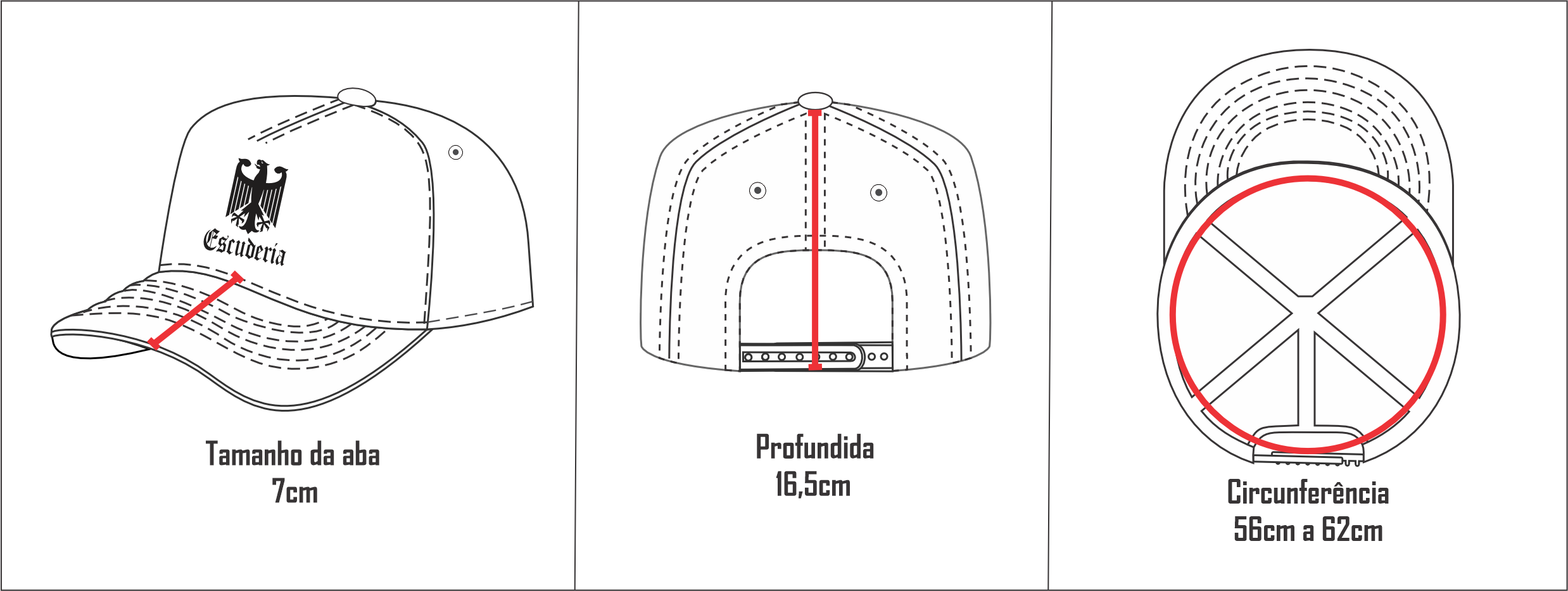 Verifique atentamente as medidas do boné indicadas acima e no desenho ilustrativo abaixo antes de finalizar seu pedido.